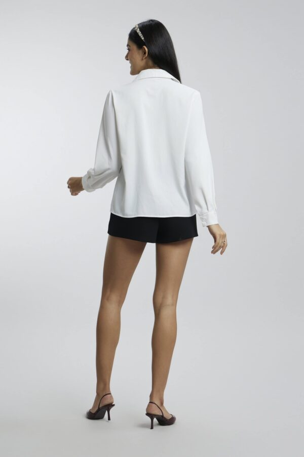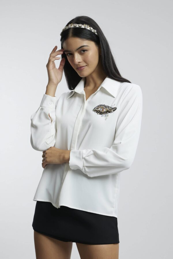 Elevate your formal wardrobe with this timeless white shirt, subtly adorned with a delicate evil eye embroidery patch.Versatile enough to wear in a variety of settings.