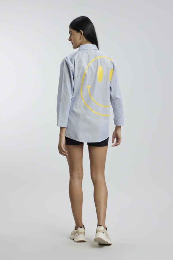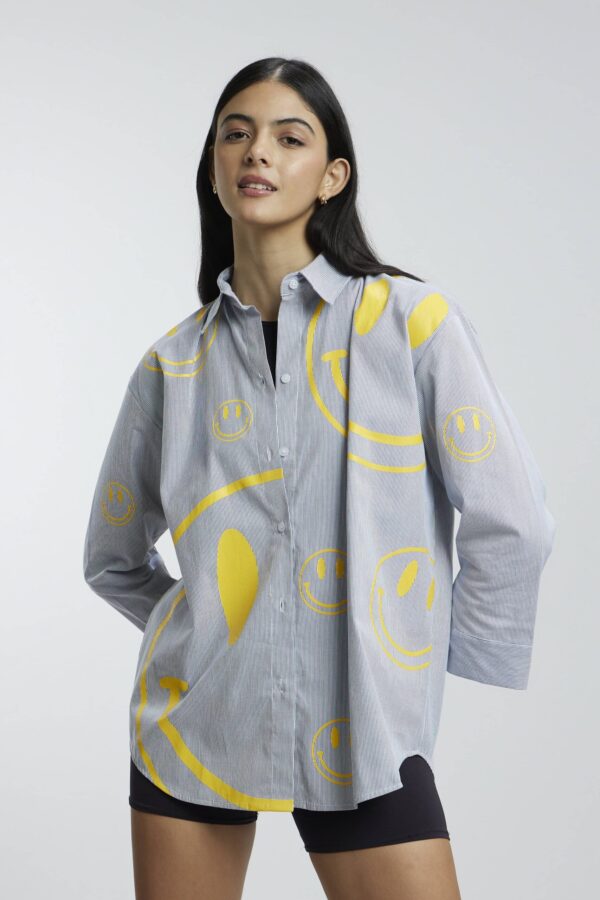 Our oversized, fun shirts are all about good vibes – splashed with blue colour and covered in bold yellow smileys. Pair it up with tight jeans or shorts or simple anything you prefer