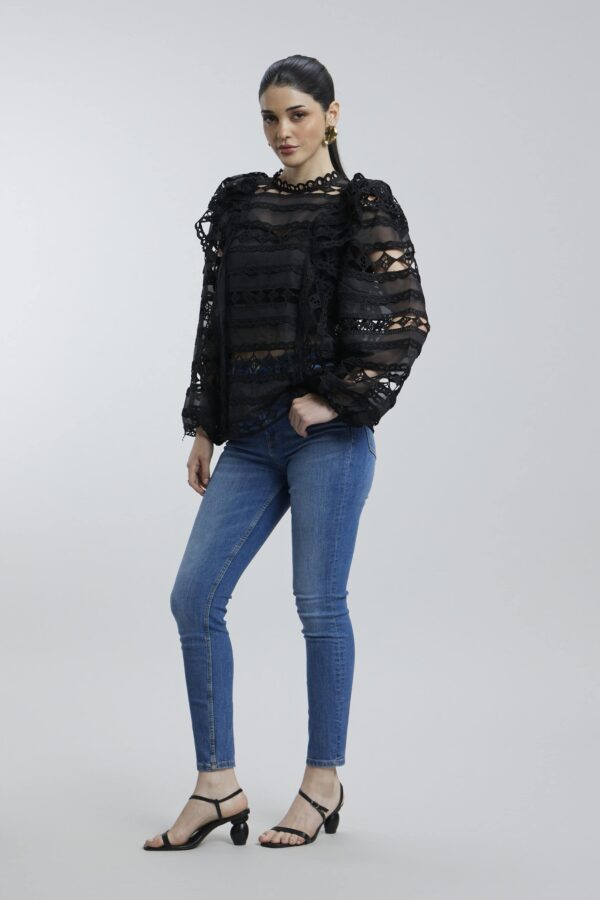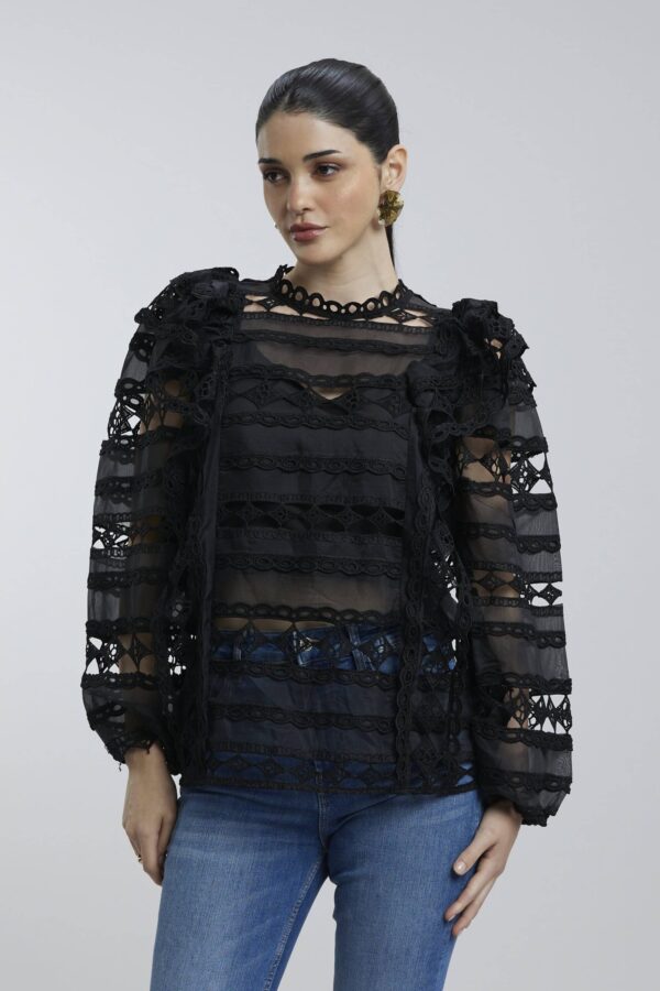 Featuring soft, cascading ruffles and a flattering silhouette, this versatile black piece brings effortless elegance to both casual and dressy outfits.